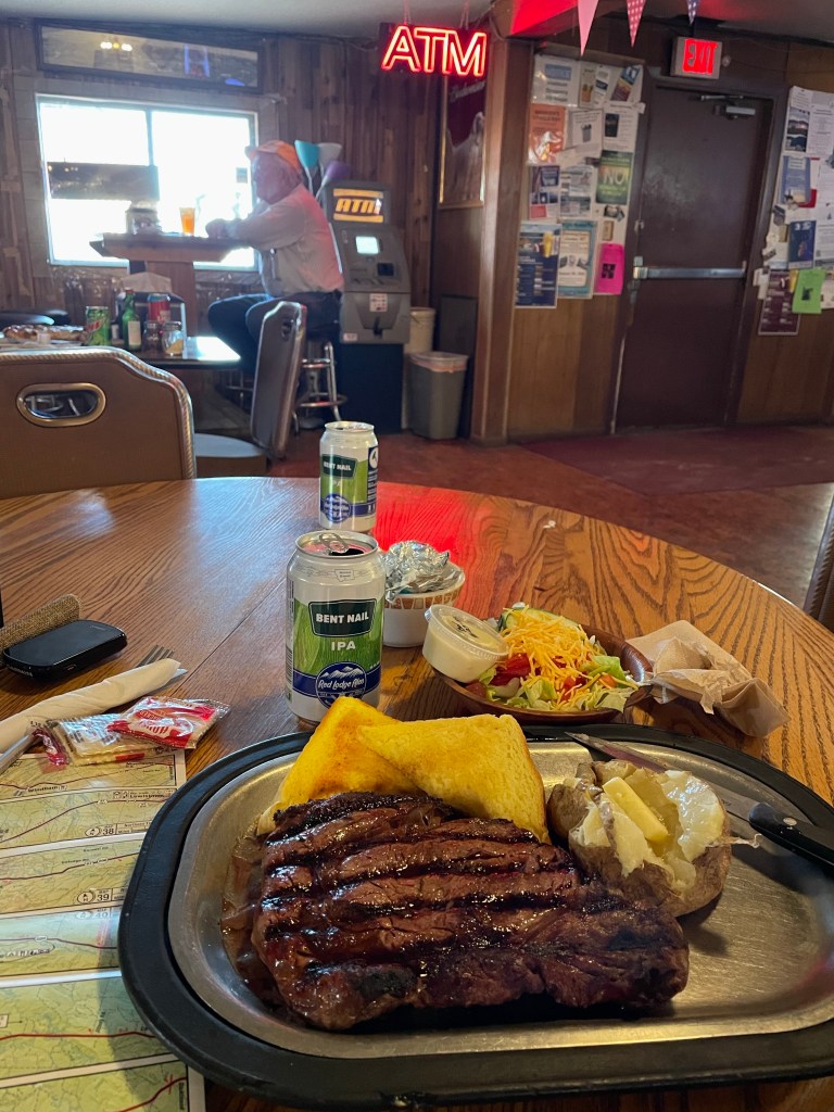 Set up my tent between some old mobile trailers, I am slumming it tonight. Store clerk warned me about the crazy woman and dog that lives in trailer next to me, said just ignore her. As I set up my tent I waved and smiled at her and her barking dog. Walked across street to the Wrangler Bar and spoiled myself with a ribeye dinner. We shall see if it is worth it? I find some of the scariest looking places have the best food. And, Montana did not disappoint, a great ribeye dinner.