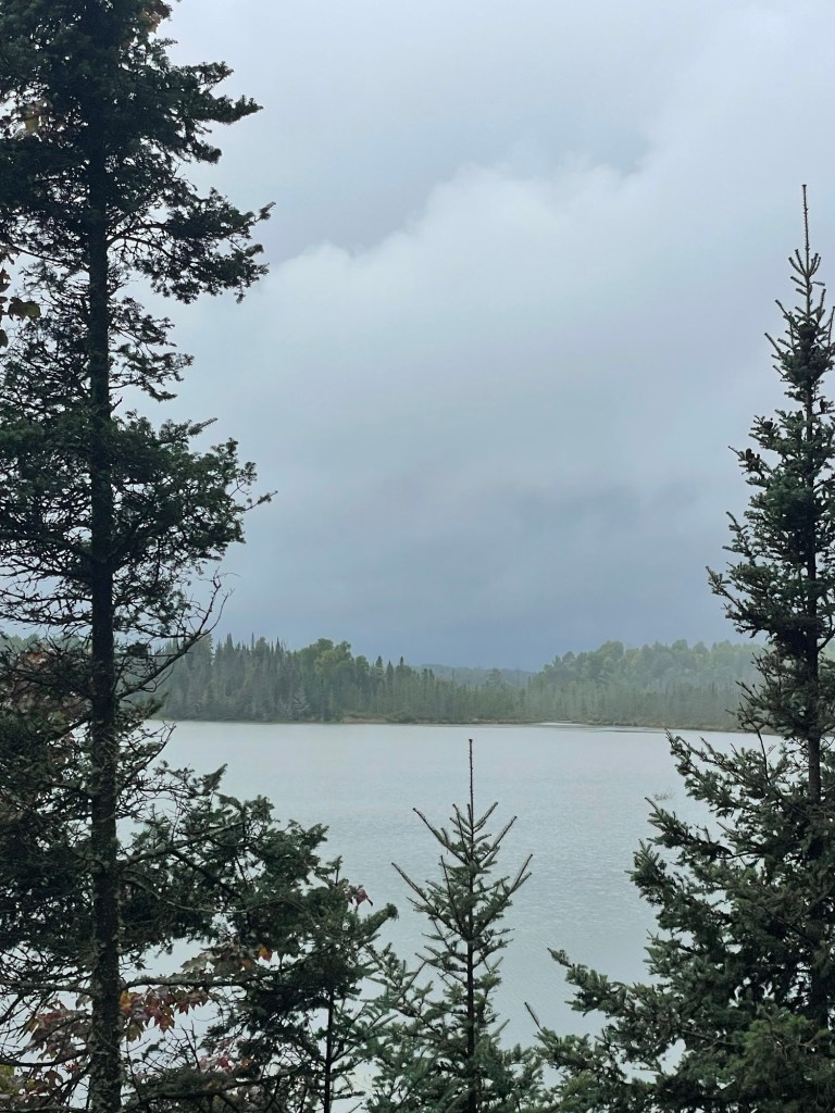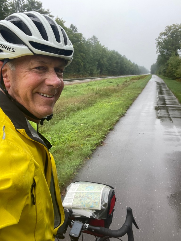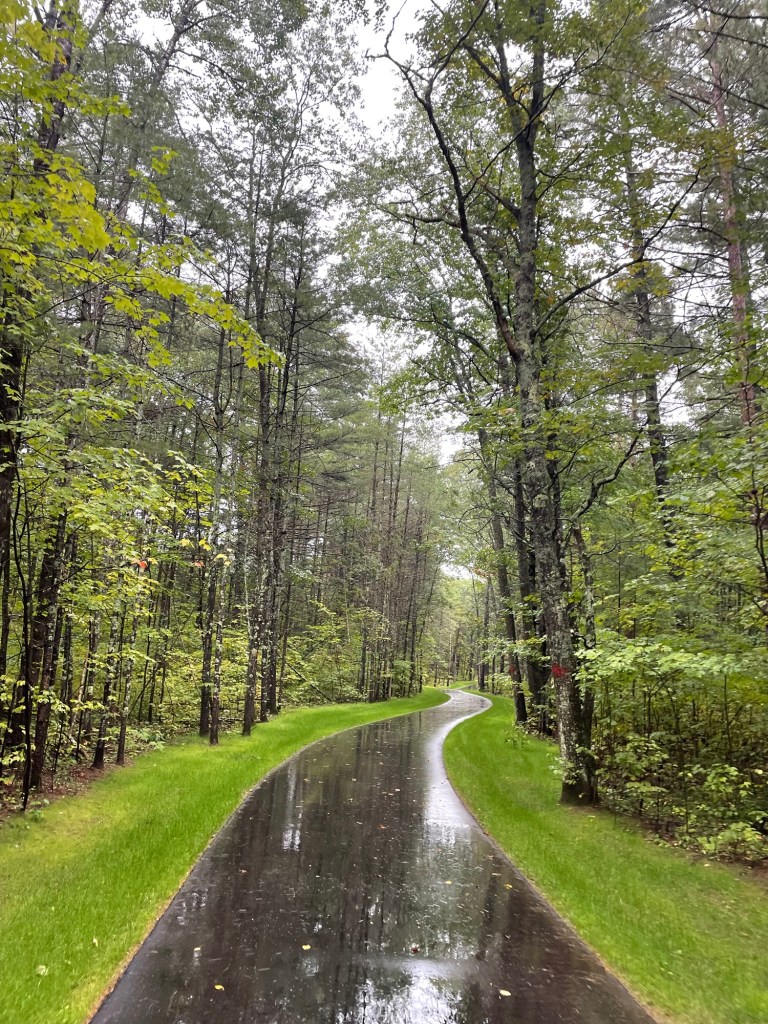 So happy I am on the Heart of Vilas County Bike Trail just to the side of Hwy 51. I will be on this paved smooth bike trail all the way to Boulder Junction 30 miles! I can see the cars and trucks on the highway wizzing by and the spray from the wet roads and fast moving vehicles would have gotten me soaked! So glad I am on this quiet bike trail. I don’t even mind the light rain and drizzle.