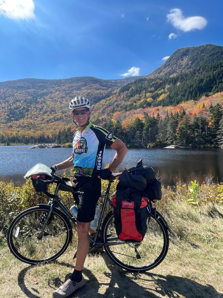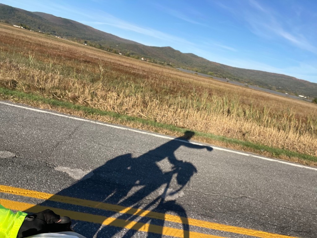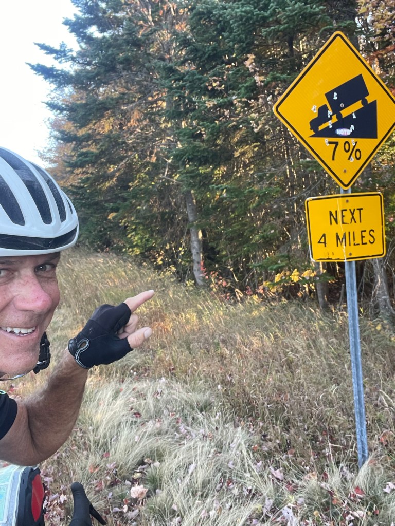 Another clear crisp day to ride through Vermont. I can see my breath as I sip my coffee on the park bench in town. Getting myself motivated to tackle the day and the climbs. My feet are cold as I ride with my trusty black windbreaker jacket and my yellow bright riding jacket.