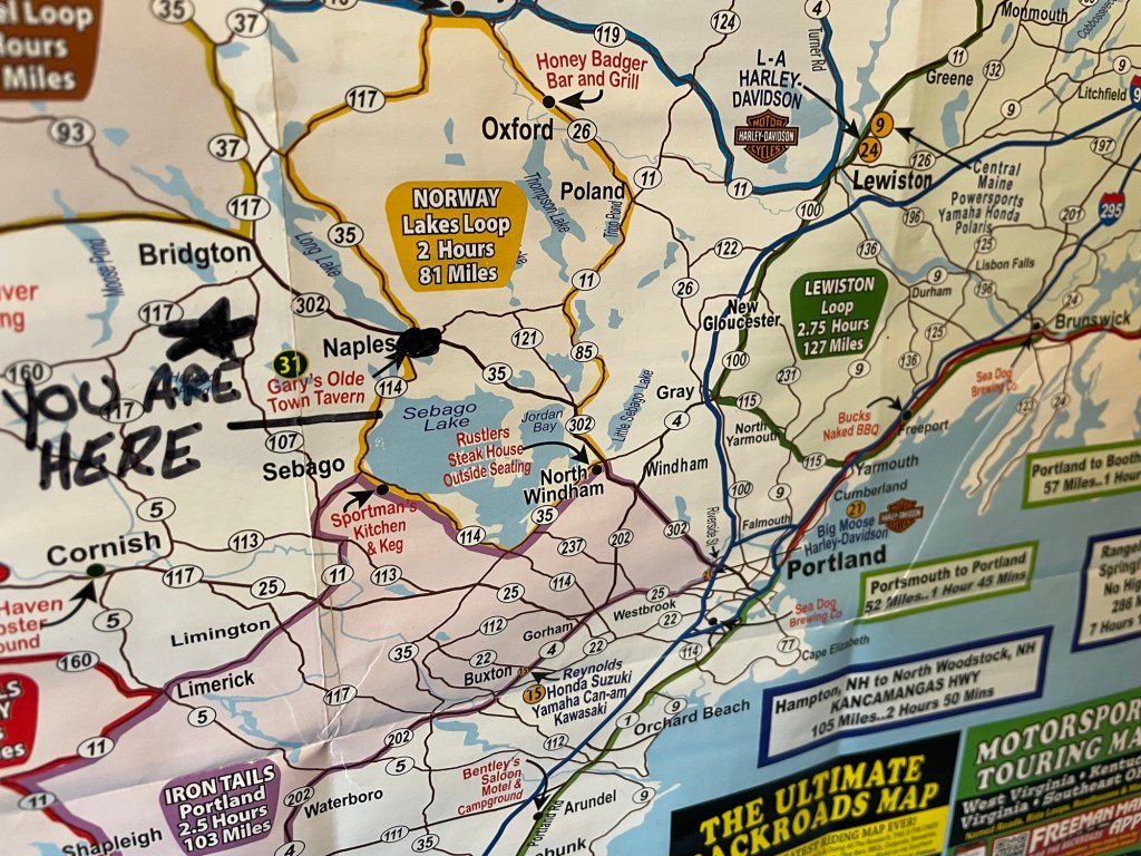 We stopped for a late breakfast in Conway and continued riding to Naples, Maine. We had a great steak tip dinner and walked back to our motel in the dark on shoulder of highway. It was nice to be back in a bed and have a shower after the past two nights camping.
